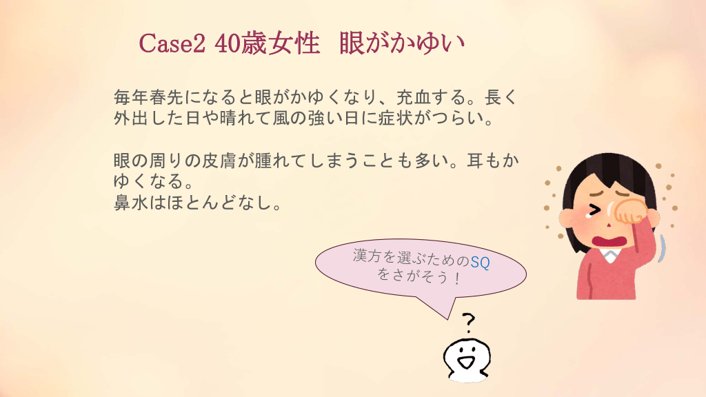 #20. Case2 40歳女性 眼がかゆい 毎年春先になると眼がかゆくなり、充血する。長く 外出した日や晴れて風の強い日に症状がつらい。 眼の周りの皮膚が腫れてしまうことも多い。耳もか ゆくなる。 鼻水はほとんどなし。