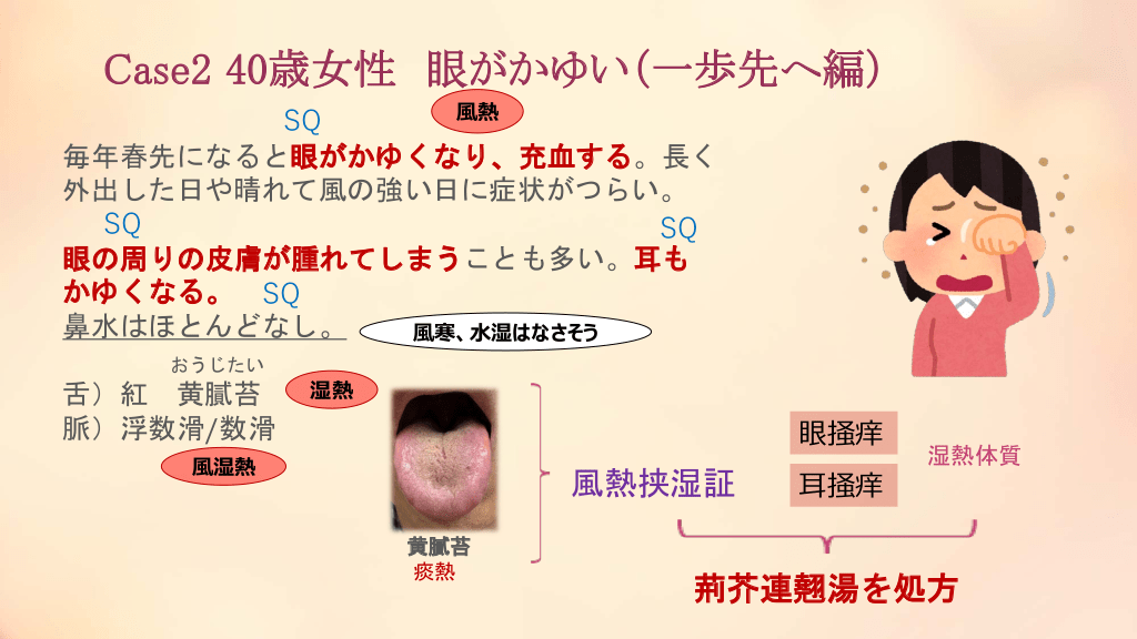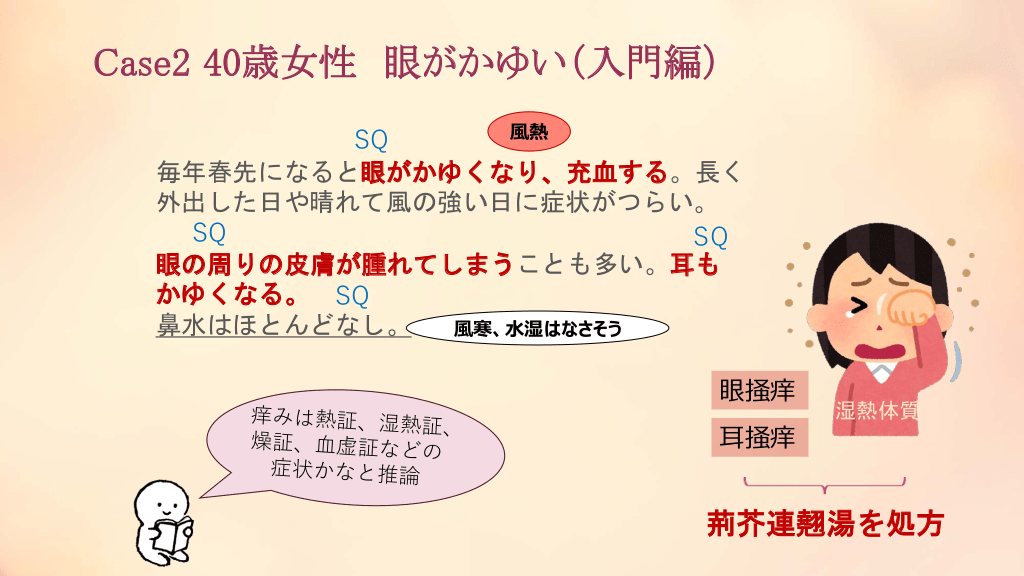 #21. Case2 40歳女性 眼がかゆい(入門編) 風熱 SQ 毎年春先になると眼がかゆくなり、充血する。長く 外出した日や晴れて風の強い日に症状がつらい。 SQ SQ 眼の周りの皮膚が腫れてしまうことも多い。耳も かゆくなる。 SQ 鼻水はほとんどなし。 風寒、水湿はなさそう 眼掻痒 耳掻痒 湿熱体質 荊芥連翹湯を処方
