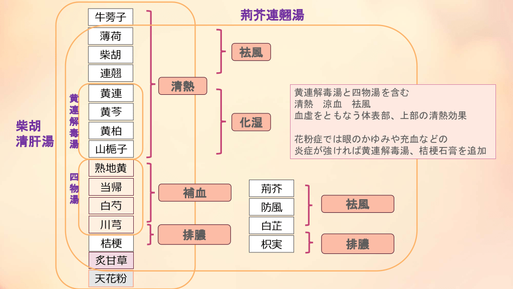#23. 荊芥連翹湯 牛蒡子 薄荷 袪風 柴胡 連翹 柴胡 清肝湯 黄 連 解 毒 湯 四 物 湯 黄連 清熱 黄芩 化湿 黄柏 黄連解毒湯と四物湯を含む 清熱 涼血 袪風 血虚をともなう体表部、上部の清熱効果 花粉症では眼のかゆみや充血などの 炎症が強ければ黄連解毒湯、桔梗石膏を追加 山梔子 熟地黄 当帰 白芍 川芎 桔梗 炙甘草 天花粉 補血 荊芥 防風 排膿 袪風 白芷 枳実 排膿