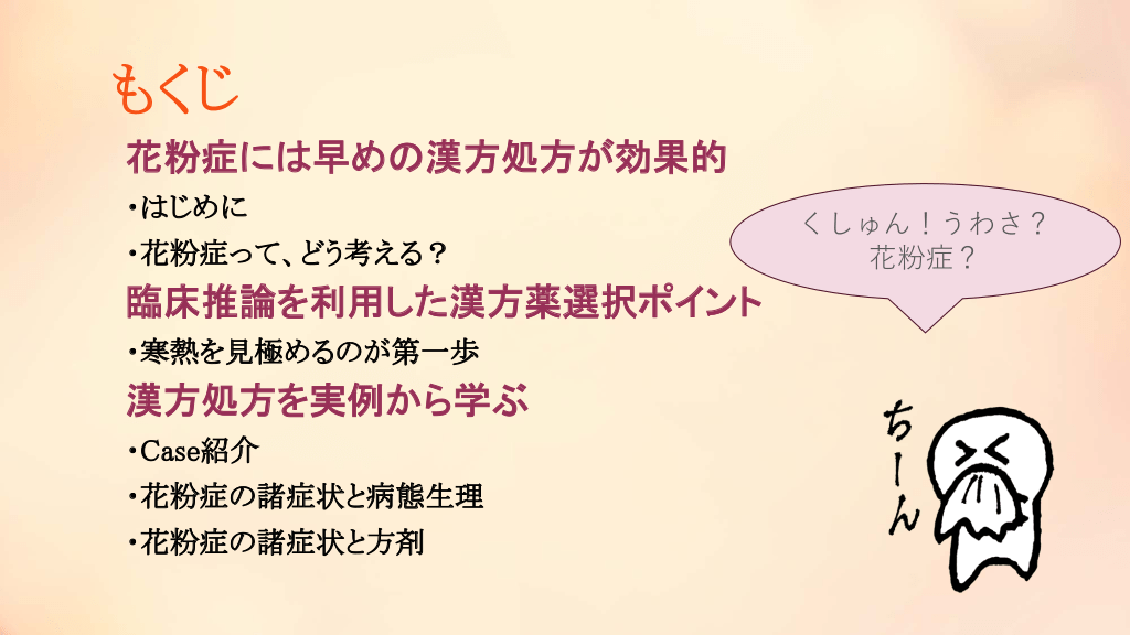 #3. もくじ 花粉症には早めの漢方処方が効果的 ・はじめに ・花粉症って、どう考える? 臨床推論を利用した漢方薬選択ポイント ・寒熱を見極めるのが第一歩 漢方処方を実例から学ぶ ・Case紹介 ・花粉症の諸症状と病態生理 ・花粉症の諸症状と方剤 くしゅん!うわさ? 花粉症?