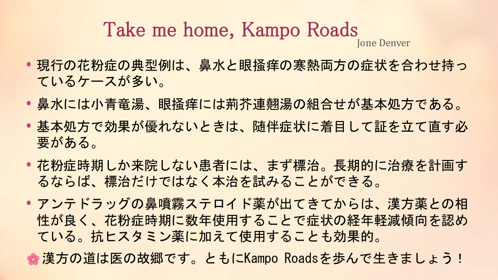 #31. Take me home, Kampo RoadsJone Denver • 現行の花粉症の典型例は、鼻水と眼掻痒の寒熱両方の症状を合わせ持っ ているケースが多い。 • 鼻水には小青竜湯、眼掻痒には荊芥連翹湯の組合せが基本処方である。 • 基本処方で効果が優れないときは、随伴症状に着目して証を立て直す必 要がある。 • 花粉症時期しか来院しない患者には、まず標治。長期的に治療を計画す るならば、標治だけではなく本治を試みることができる。 • アンテドラッグの鼻噴霧ステロイド薬が出てきてからは、漢方薬との相 性が良く、花粉症時期に数年使用することで症状の経年軽減傾向を認め ている。抗ヒスタミン薬に加えて使用することも効果的。 漢方の道は医の故郷です。ともにKampo Roadsを歩んで生きましょう!