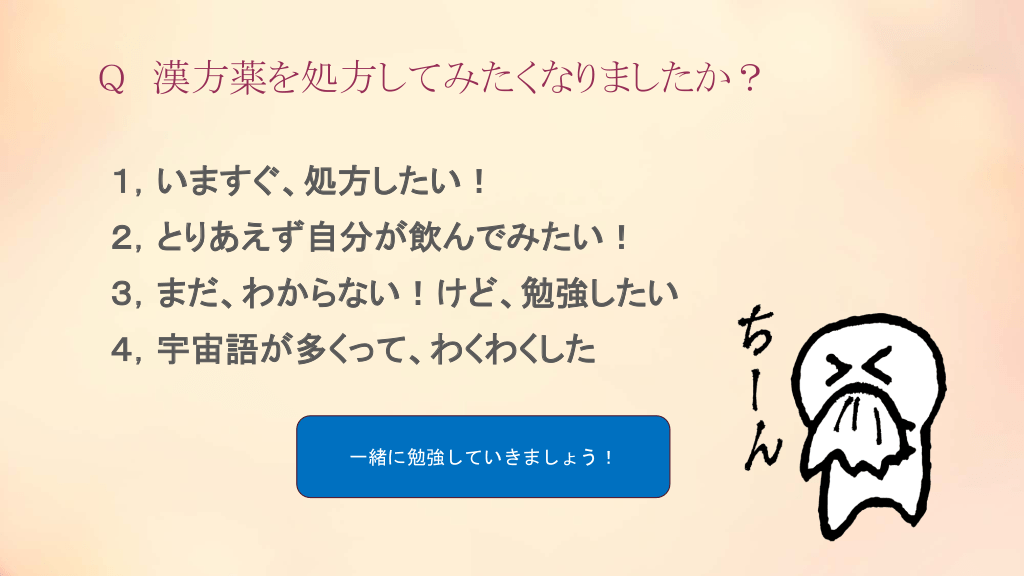 #32. Q 漢方薬を処方してみたくなりましたか? 1,いますぐ、処方したい! 2,とりあえず自分が飲んでみたい! 3,まだ、わからない!けど、勉強したい 4,宇宙語が多くって、わくわくした 一緒に勉強していきましょう!
