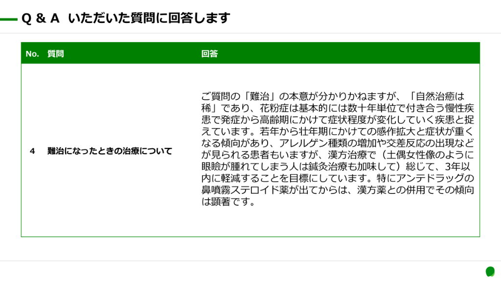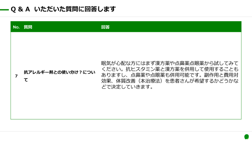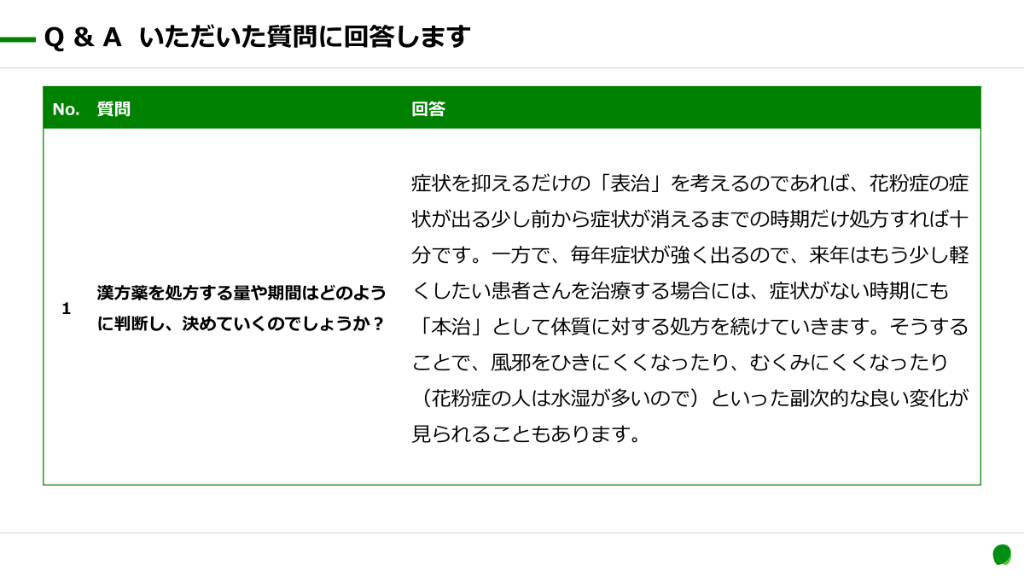#8. 抗原回避 花粉の量だけでは なく体調で症状が 変わるのはなぜ? 免疫療法 症状抑制 鼻水の人と 目がかゆい人がい るのはなぜ? 症状が出ているとき に抑えるしか治療法 はないの? 漢方について勉強すると、これらの疑問に答える 考え方を学ぶことができます。