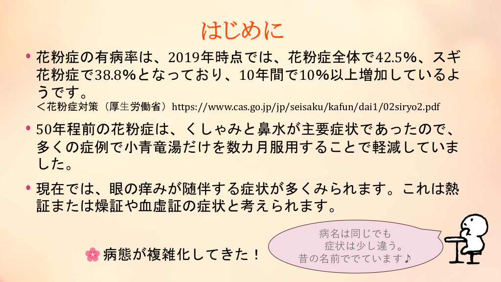 #4. はじめに • 花粉症の有病率は、2019年時点では、花粉症全体で42.5%、スギ 花粉症で38.8%となっており、10年間で10%以上増加しているよ うです。 <花粉症対策(厚⽣労働省)https://www.cas.go.jp/jp/seisaku/kafun/dai1/02siryo2.pdf • 50年程前の花粉症は、くしゃみと鼻水が主要症状であったので、 多くの症例で小青竜湯だけを数カ月服用することで軽減していま した。 • 現在では、眼の痒みが随伴する症状が多くみられます。これは熱 証または燥証や血虚証の症状と考えられます。 病態が複雑化してきた! 病名は同じでも 症状は少し違う。 昔の名前ででています♪