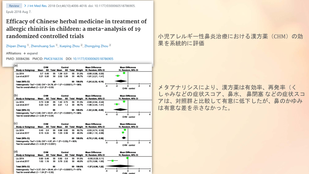 #6. 小児アレルギー性鼻炎治療における漢方薬(CHM)の効 果を系統的に評価 メタアナリシスにより、漢方薬は有効率、再発率(く しゃみなどの症状スコア、鼻水、 鼻閉塞 などの症状スコ アは、対照群と比較して有意に低下したが、鼻のかゆみ は有意な差を示さなかった。