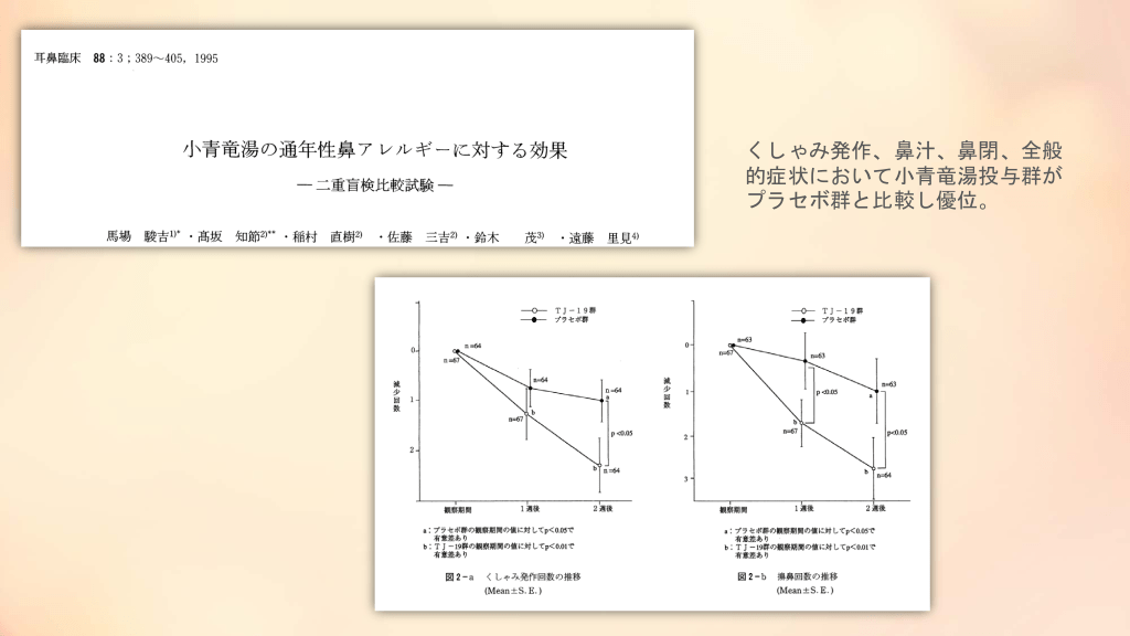#7. くしゃみ発作、鼻汁、鼻閉、全般 的症状において小青竜湯投与群が プラセボ群と比較し優位。