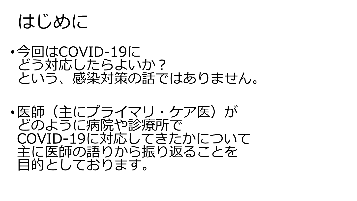 本スライドでは、地域や生活の場に関心を持つ傾向にあるプライマリ・ケア医に注目したインタビュー調査から得られた知見をご紹介します。