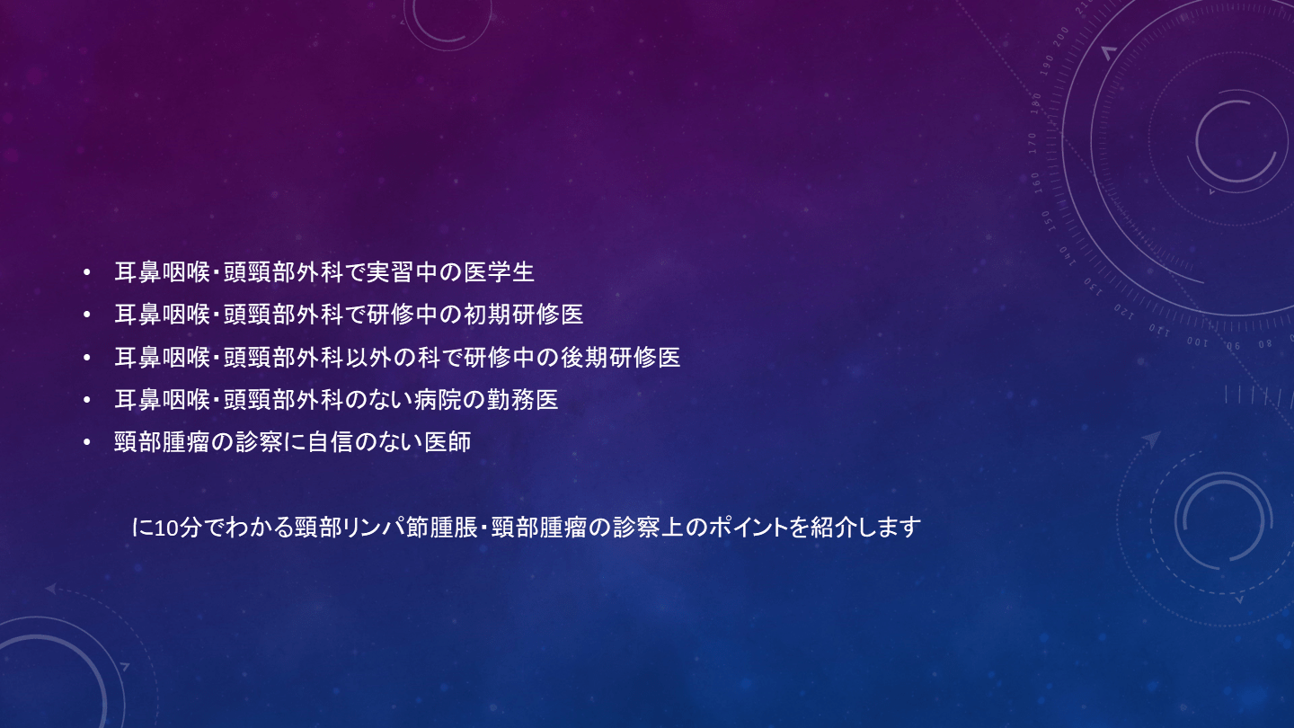 耳鼻咽喉・頭頸部外科で実習中の医学生、研修中の初期研修医、耳鼻咽喉・頭頸部外科以外の科で研修中の後期研修医に向けて10分でわかる様に頸部リンパ節腫脹・頸部腫瘤の診察上のポイントを紹介しています。