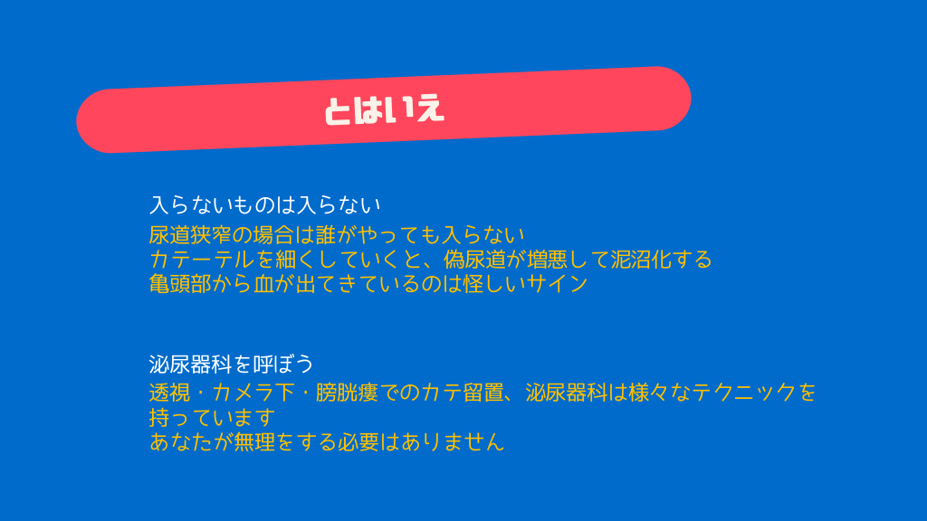 #10. 入らないものは入らない 尿道狭窄の場合は誰がやっても入らない カテーテルを細くしていくと、偽尿道が増悪して泥沼化する 亀頭部から血が出てきているのは怪しいサイン 泌尿器科を呼ぼう 透視・カメラ下・膀胱瘻でのカテ留置、泌尿器科は様々なテクニックを 持っています あなたが無理をする必要はありません