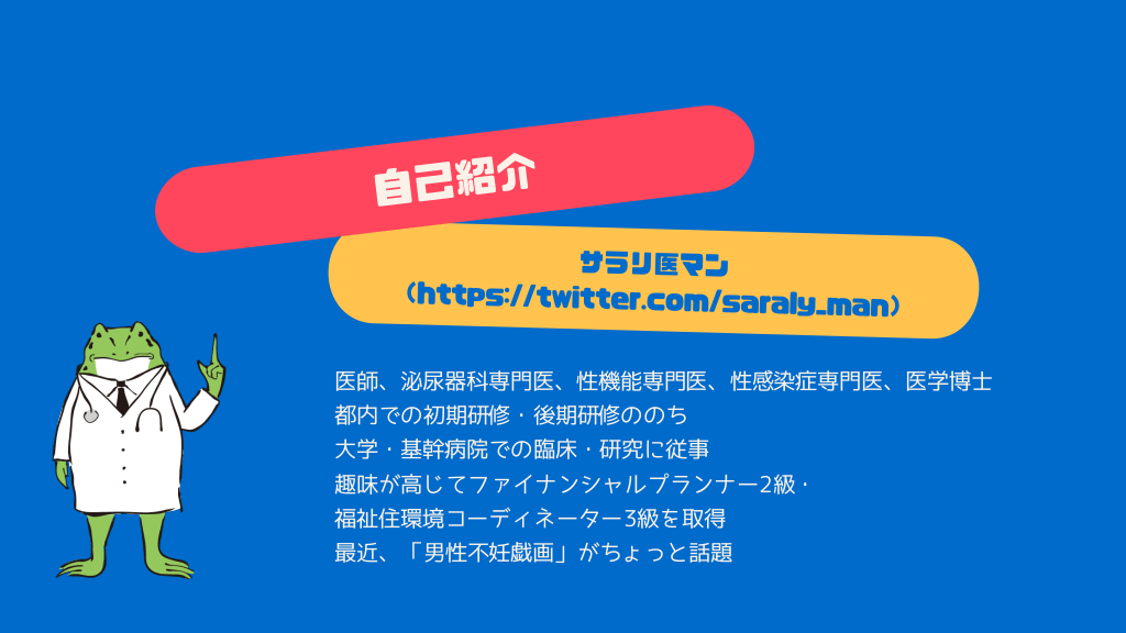 #2. 医師、泌尿器科専門医、性機能専門医、性感染症専門医、医学博士 都内での初期研修・後期研修ののち 大学・基幹病院での臨床・研究に従事 趣味が高じてファイナンシャルプランナー2級・ 福祉住環境コーディネーター3級を取得 最近、「男性不妊戯画」がちょっと話題