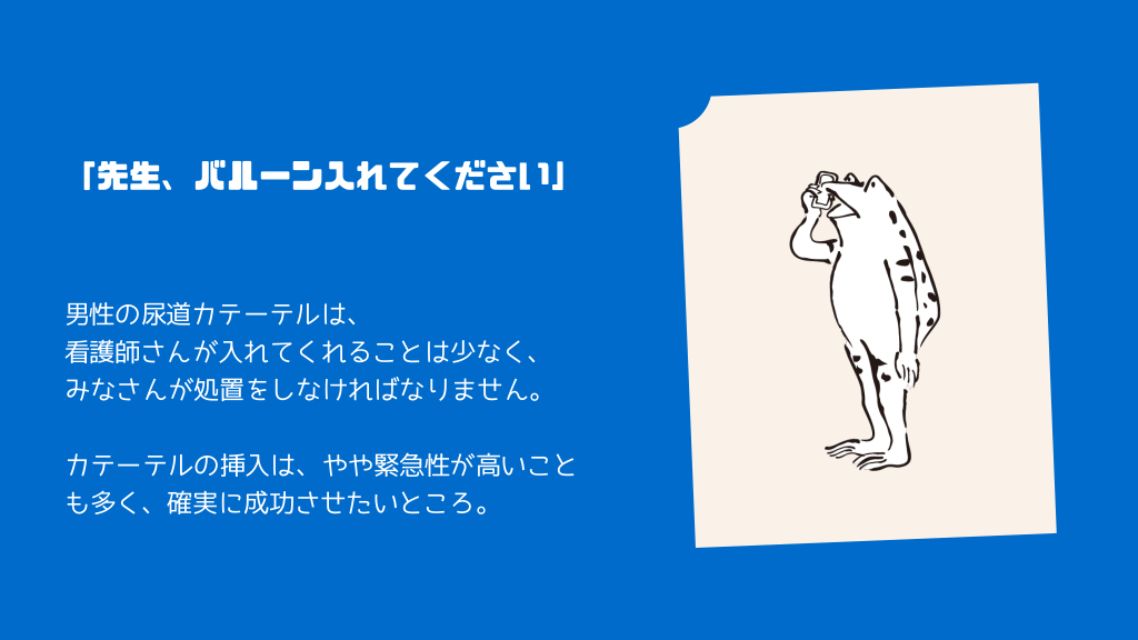 #3. 「先生、バルーン入れてください」 男性の尿道カテーテルは、 看護師さんが入れてくれることは少なく、 みなさんが処置をしなければなりません。 カテーテルの挿入は、やや緊急性が高いこと も多く、確実に成功させたいところ。