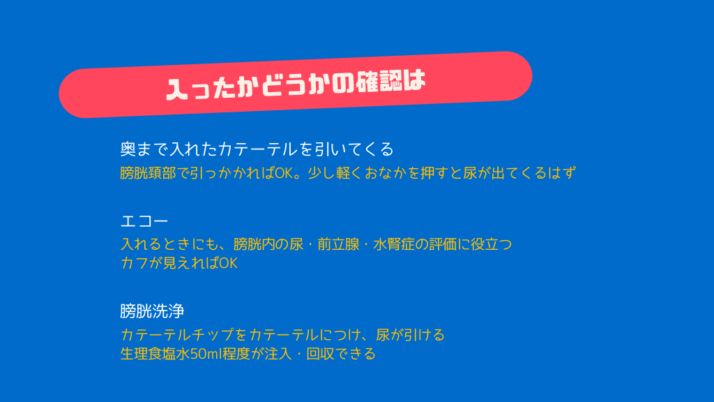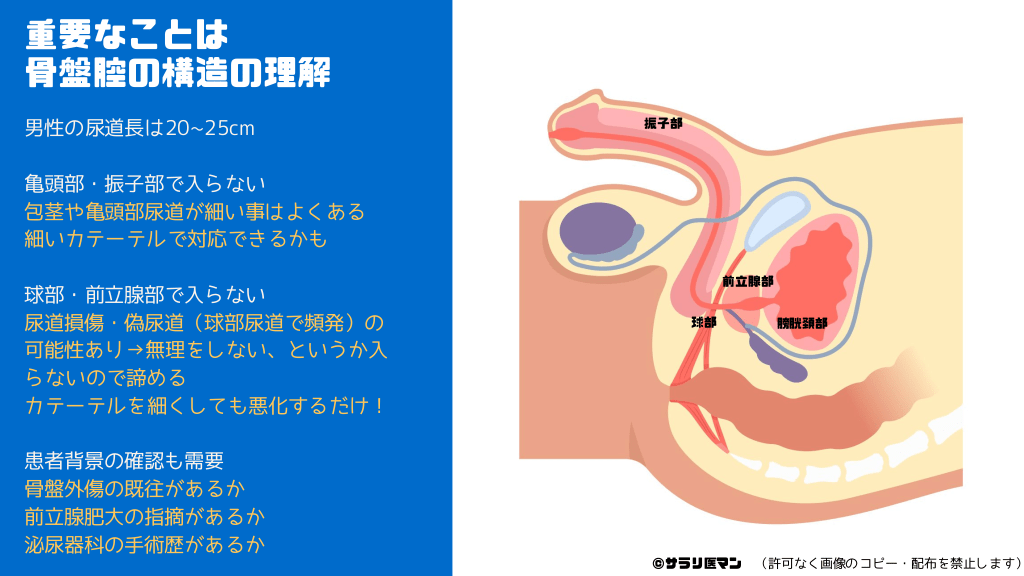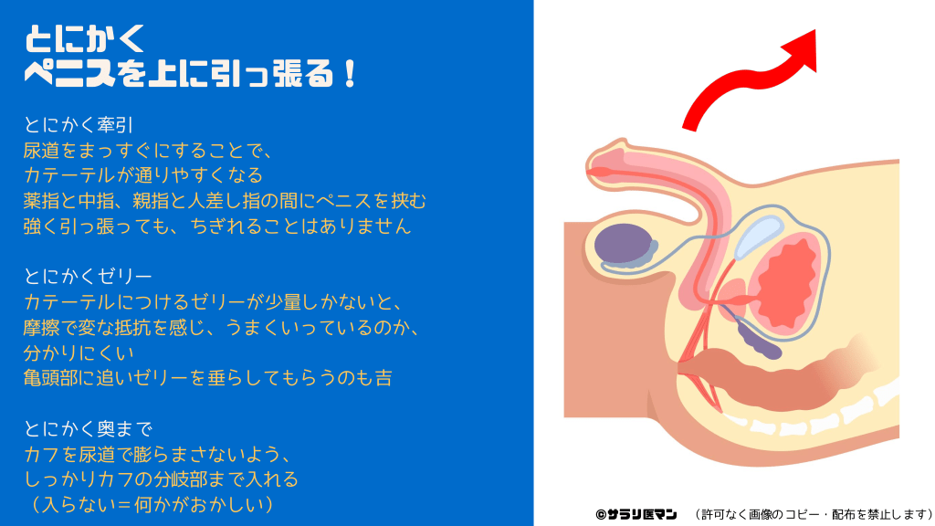 #6. とにかく ペニスを上に引っ張る! とにかく牽引 尿道をまっすぐにすることで、 カテーテルが通りやすくなる 薬指と中指、親指と人差し指の間にペニスを挟む 強く引っ張っても、ちぎれることはありません とにかくゼリー カテーテルにつけるゼリーが少量しかないと、 摩擦で変な抵抗を感じ、うまくいっているのか、 分かりにくい 亀頭部に追いゼリーを垂らしてもらうのも吉 とにかく奥まで カフを尿道で膨らまさないよう、 しっかりカフの分岐部まで入れる (入らない=何かがおかしい) ©サラリ医マン (許可なく画像のコピー・配布を禁止します)