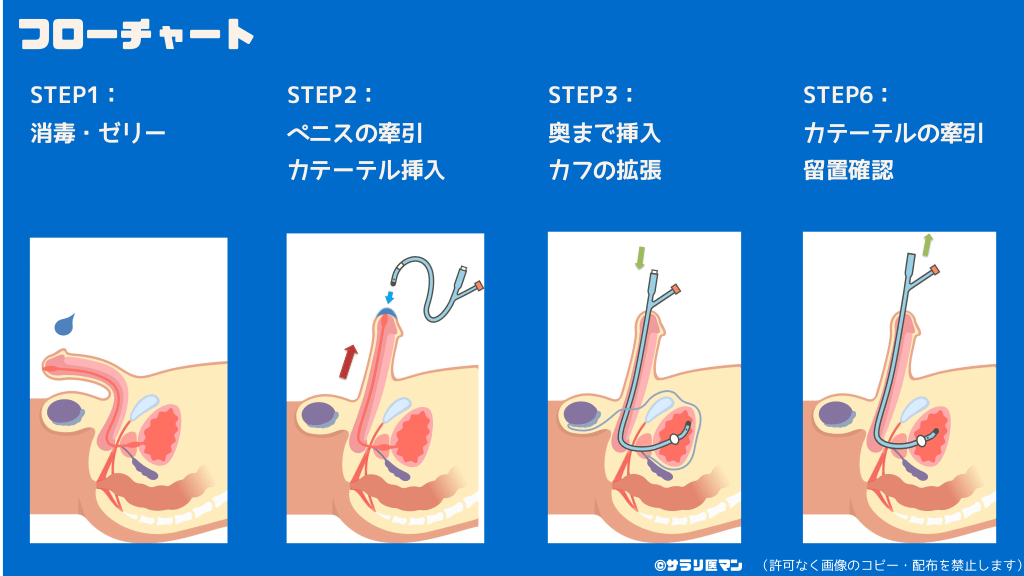 #7. フローチャート STEP1: STEP2: STEP3: STEP6: 消毒・ゼリー ペニスの牽引 奥まで挿入 カテーテルの牽引 カテーテル挿入 カフの拡張 留置確認 ©サラリ医マン (許可なく画像のコピー・配布を禁止します)