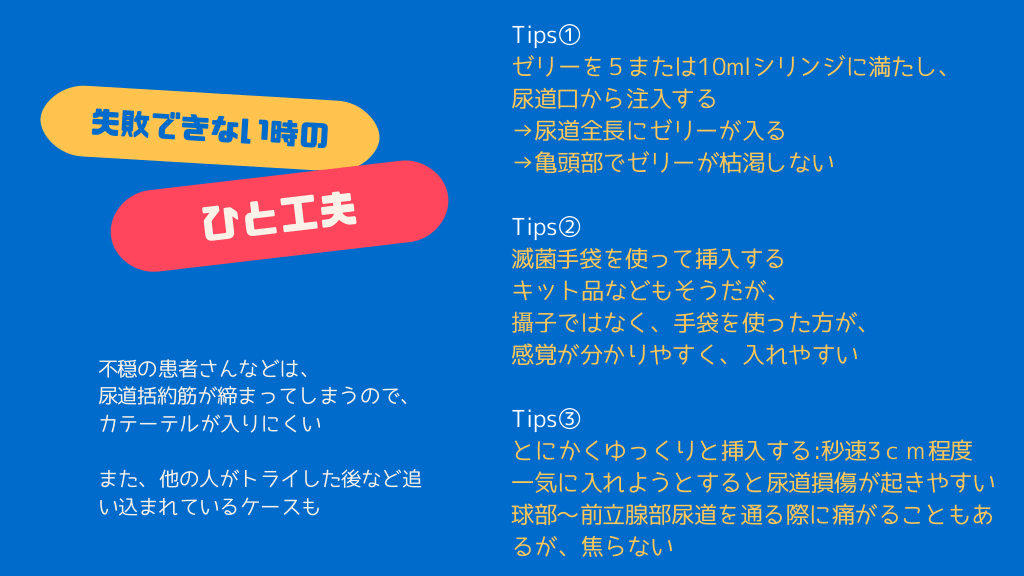 #8. Tips① ゼリーを5または10mlシリンジに満たし、 尿道口から注入する →尿道全長にゼリーが入る →亀頭部でゼリーが枯渇しない 不穏の患者さんなどは、 尿道括約筋が締まってしまうので、 カテーテルが入りにくい また、他の人がトライした後など追 い込まれているケースも Tips② 滅菌手袋を使って挿入する キット品などもそうだが、 攝子ではなく、手袋を使った方が、 感覚が分かりやすく、入れやすい Tips③ とにかくゆっくりと挿入する:秒速3cm程度 一気に入れようとすると尿道損傷が起きやすい 球部~前立腺部尿道を通る際に痛がることもあ るが、焦らない