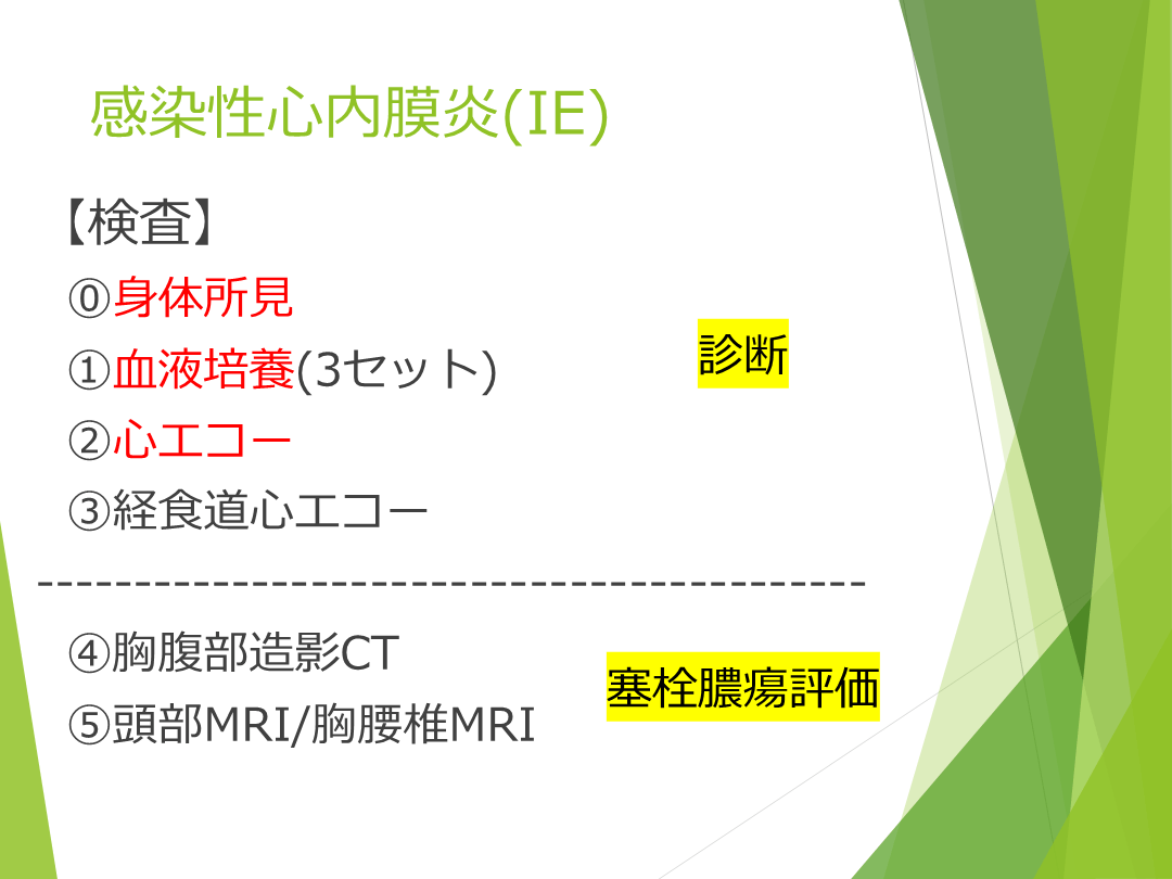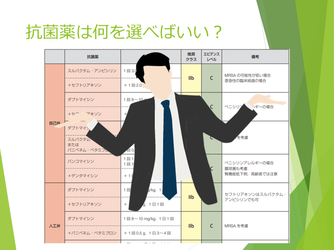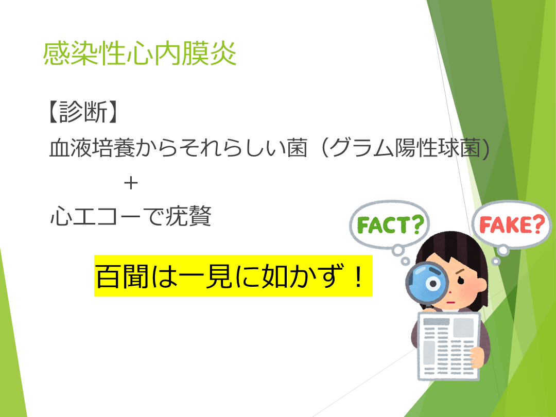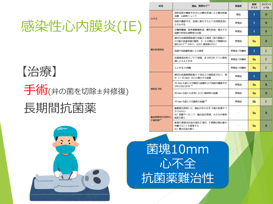・全身の塞栓と菌種をみて抗菌薬や治療期間を