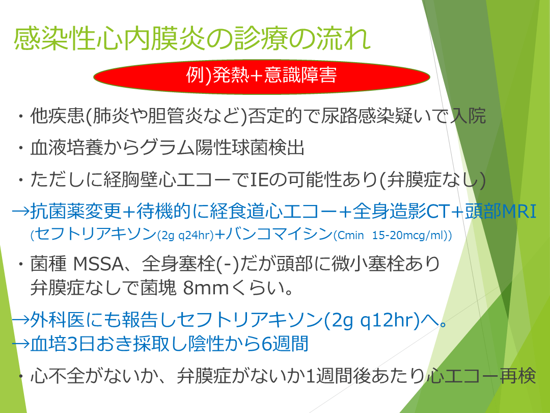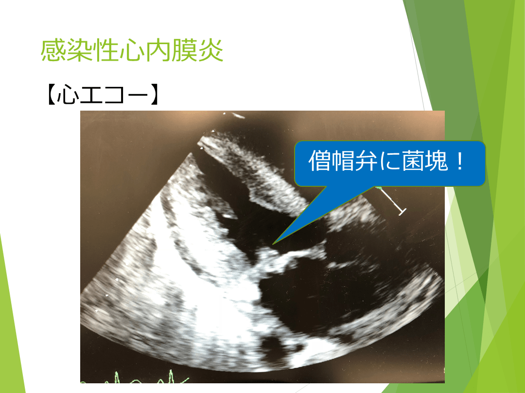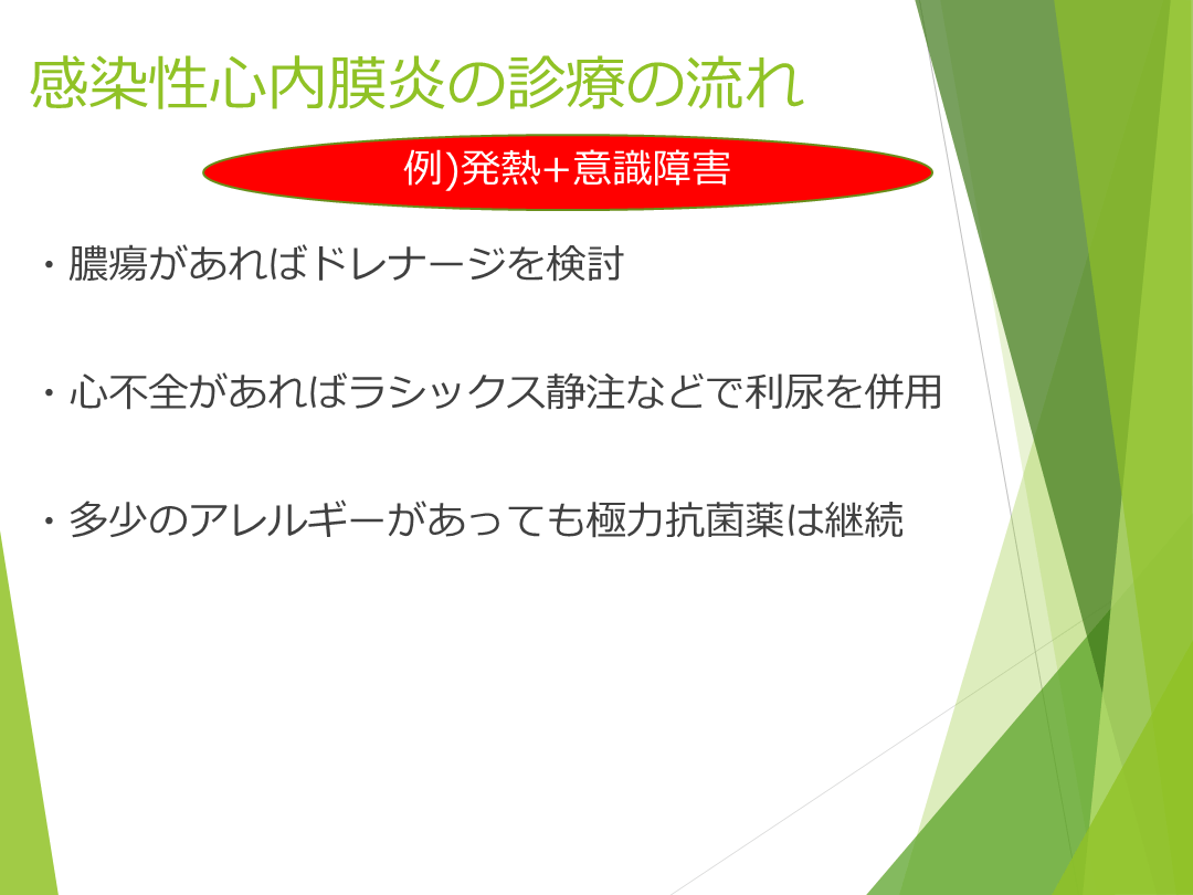 ・心不全がないか、弁膜症がないか1週間後あたり心エコー再検 例)発熱+意識障害