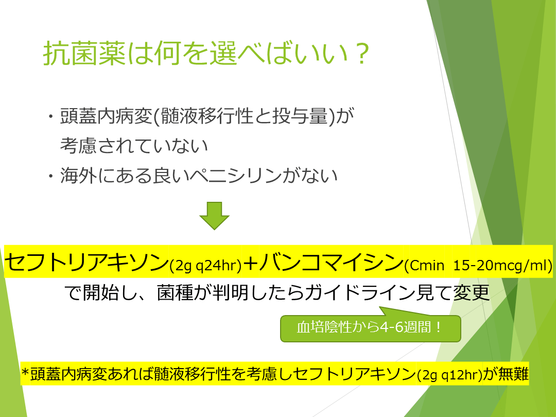 セフトリアキソン(2g q24hr)+バンコマイシン(Cmin 15-20mcg/ml) で開始し、菌種が判明したらガイドライン見て変更 *頭蓋内病変あれば髄液移行性を考慮しセフトリアキソン(2g q12hr)が無難 血培陰性から4-6週間!