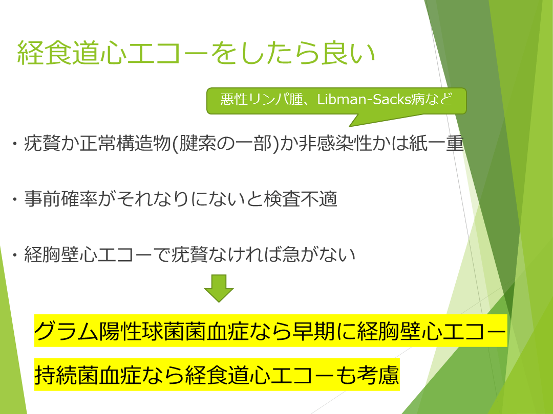 ・経胸壁心エコーで疣贅なければ急がない 悪性リンパ腫、Libman-Sacks病など グラム陽性球菌菌血症なら早期に経胸壁心エコー