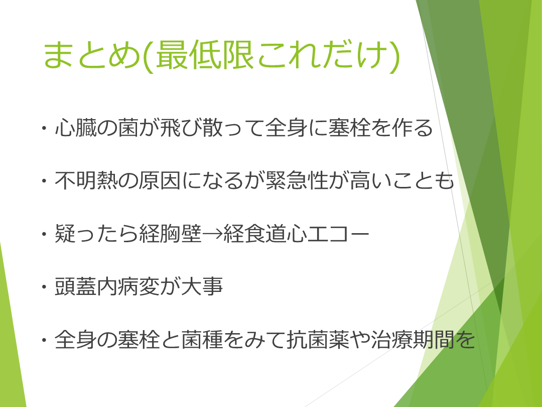 #19. まとめ(最低限これだけ) ・心臓の菌が飛び散って全身に塞栓を作る