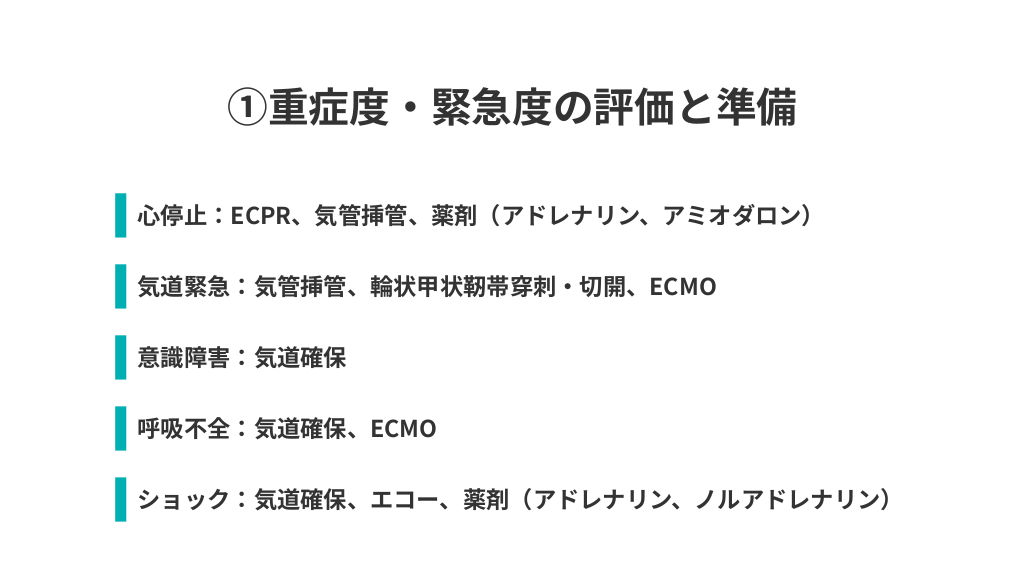 #2. ①重症度・緊急度の評価と準備 心停止:ECPR、気管挿管、薬剤(アドレナリン、アミオダロン) 気道緊急:気管挿管、輪状甲状靭帯穿刺・切開、ECMO 意識障害:気道確保 呼吸不全:気道確保、ECMO ショック:気道確保、エコー、薬剤(アドレナリン、ノルアドレナリン)