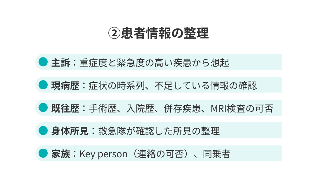 #3. ②患者情報の整理 主訴:重症度と緊急度の高い疾患から想起 現病歴:症状の時系列、不足している情報の確認 既往歴:手術歴、入院歴、併存疾患、MRI検査の可否 身体所見:救急隊が確認した所見の整理 家族:Key person(連絡の可否)、同乗者