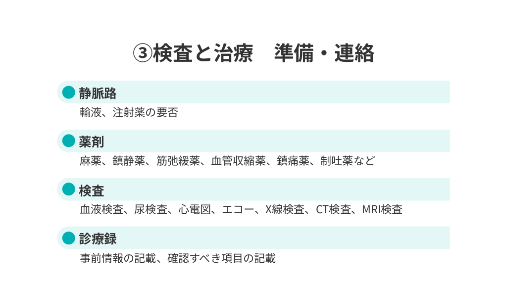 #4. 静脈路 ③検査と治療 準備・連絡 輸液、注射薬の要否 薬剤 麻薬、鎮静薬、筋弛緩薬、血管収縮薬、鎮痛薬、制吐薬など 検査 血液検査、尿検査、心電図、エコー、X線検査、CT検査、MRI検査 診療録 事前情報の記載、確認すべき項目の記載
