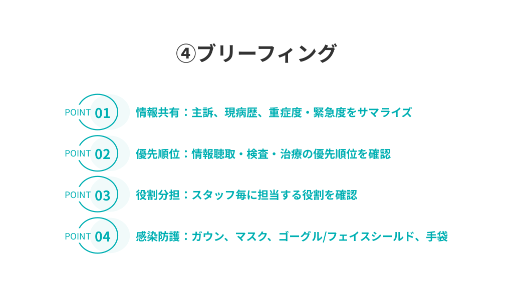 #5. ④ブリーフィング POINT 01 情報共有:主訴、現病歴、重症度・緊急度をサマライズ POINT 02 優先順位:情報聴取・検査・治療の優先順位を確認 POINT 03 役割分担:スタッフ毎に担当する役割を確認 POINT 04 感染防護:ガウン、マスク、ゴーグル/フェイスシールド、手袋