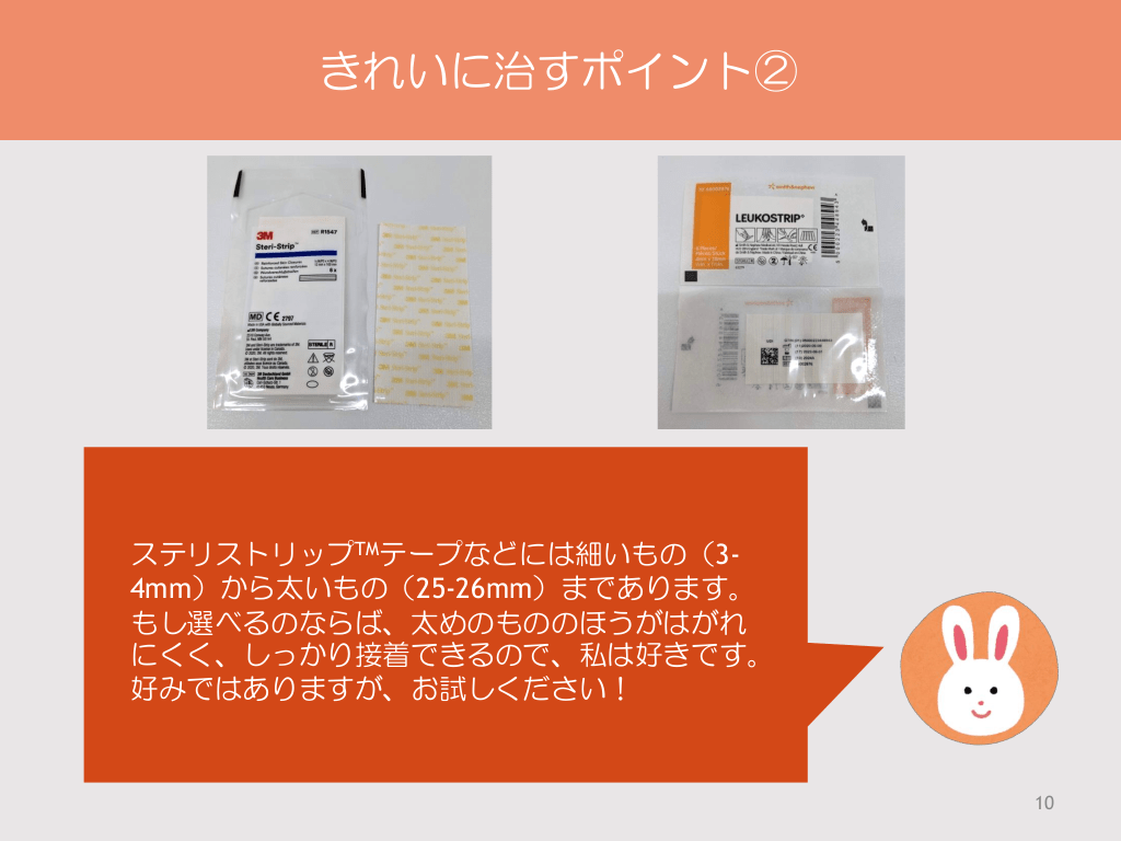 #10. きれいに治すポイント② ステリストリップTMテープなどには細いもの(34mm)から太いもの(25-26mm)まであります。 もし選べるのならば、太めのもののほうがはがれ にくく、しっかり接着できるので、私は好きです。 好みではありますが、お試しください! 10