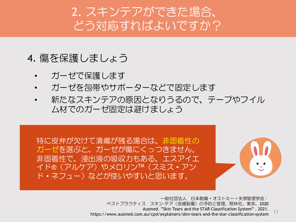#11. 2. スキンテアができた場合、 どう対応すればよいですか? 4. 傷を保護しましょう • • • ガーゼで保護します ガーゼを包帯やサポーターなどで固定します 新たなスキンテアの原因となりうるので、テープやフイル ム材でのガーゼ固定は避けましょう 特に皮弁が欠けて潰瘍が残る場合は、非固着性の ガーゼを選ぶと、ガーゼが傷にくっつきません。 非固着性で、浸出液の吸収力もある、エスアイエ イド®(アルケア)やメロリンTM(スミス・アン ド・ネフュー)などが使いやすいと思います。 一般社団法人 日本創傷・オストミー・失禁管理学会: ベストプラクティス スキン-テア(皮膚裂傷)の予防と管理.照林社、東京、2020 Ausmed. ”Skin Tears and the STAR Classification System” . 2021. https://www.ausmed.com.au/cpd/explainers/skin-tears-and-the-star-classification-system 11
