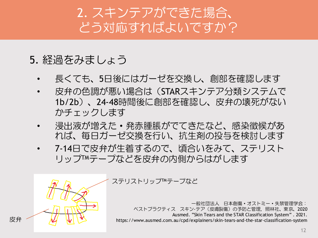 #12. 2. スキンテアができた場合、 どう対応すればよいですか? 5. 経過をみましょう • • • • 長くても、5日後にはガーゼを交換し、創部を確認します 皮弁の色調が悪い場合は(STARスキンテア分類システムで 1b/2b)、24-48時間後に創部を確認し、皮弁の壊死がない かチェックします 浸出液が増えた・発赤腫脹がでてきたなど、感染徴候があ れば、毎日ガーゼ交換を行い、抗生剤の投与を検討します 7-14日で皮弁が生着するので、頃合いをみて、ステリスト リップTMテープなどを皮弁の内側からはがします ステリストリップTMテープなど 皮弁 一般社団法人 日本創傷・オストミー・失禁管理学会: ベストプラクティス スキン-テア(皮膚裂傷)の予防と管理.照林社、東京、2020 Ausmed. ”Skin Tears and the STAR Classification System” . 2021. https://www.ausmed.com.au/cpd/explainers/skin-tears-and-the-star-classification-system 12