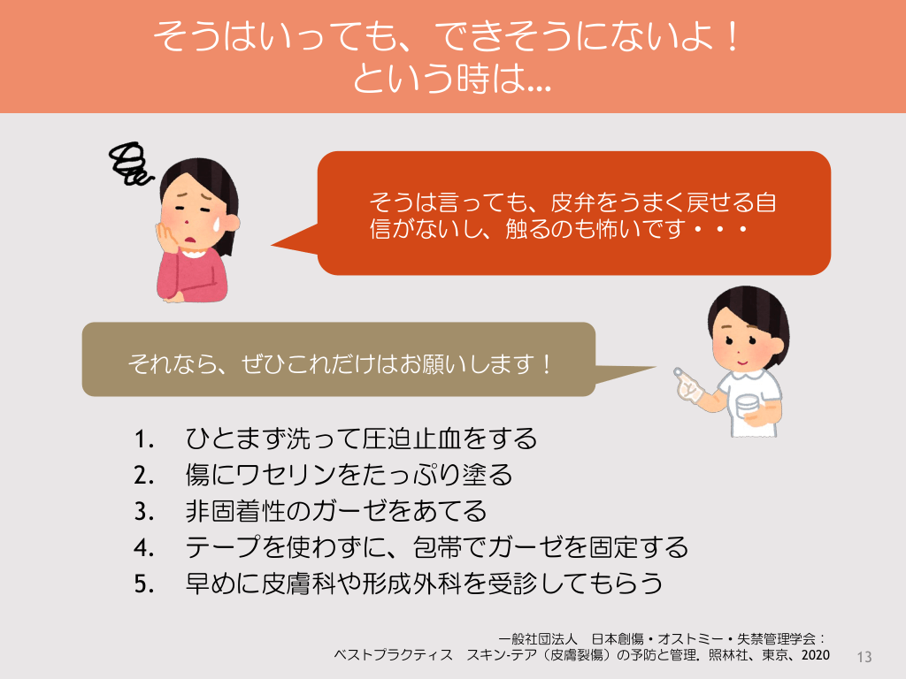 #13. そうはいっても、できそうにないよ! という時は… そうは言っても、皮弁をうまく戻せる自 信がないし、触るのも怖いです・・・ それなら、ぜひこれだけはお願いします! 1. 2. 3. 4. 5. ひとまず洗って圧迫止血をする 傷にワセリンをたっぷり塗る 非固着性のガーゼをあてる テープを使わずに、包帯でガーゼを固定する 早めに皮膚科や形成外科を受診してもらう 一般社団法人 日本創傷・オストミー・失禁管理学会: ベストプラクティス スキン-テア(皮膚裂傷)の予防と管理.照林社、東京、2020 13