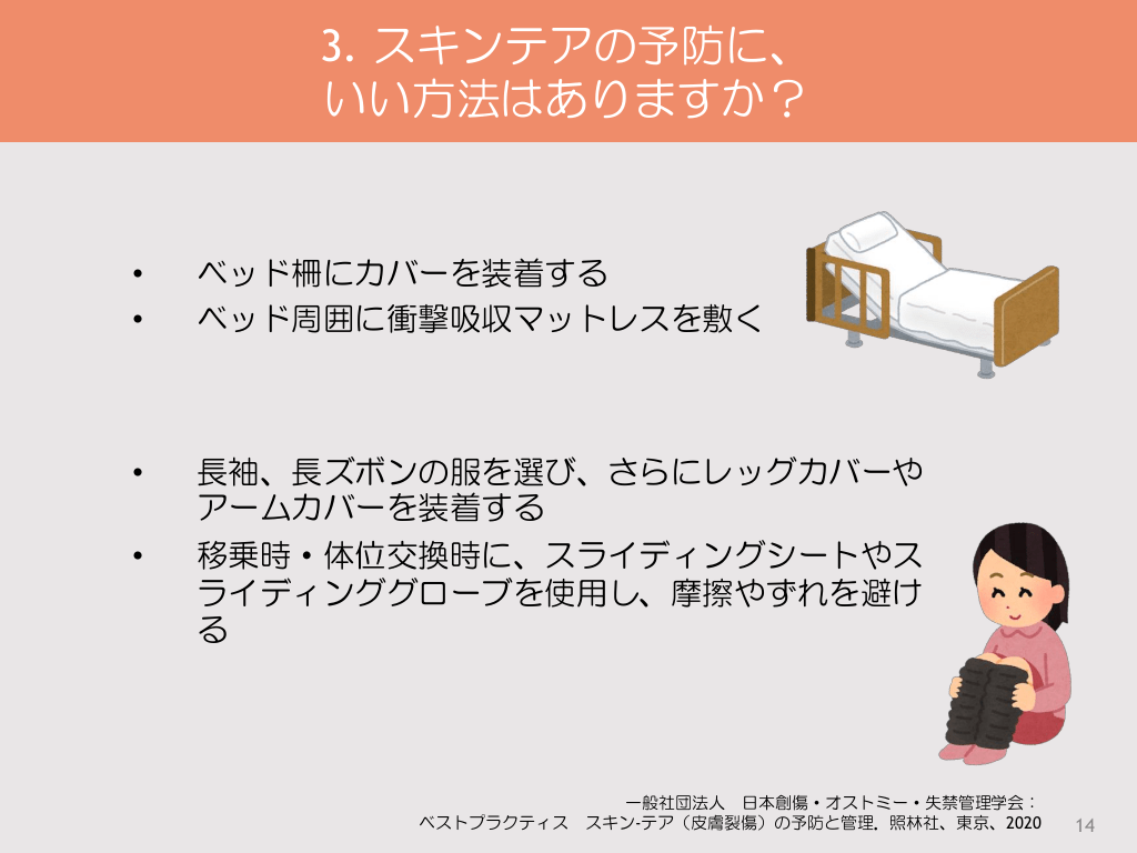 #14. 3. スキンテアの予防に、 いい方法はありますか? • • ベッド柵にカバーを装着する ベッド周囲に衝撃吸収マットレスを敷く • 長袖、長ズボンの服を選び、さらにレッグカバーや アームカバーを装着する 移乗時・体位交換時に、スライディングシートやス ライディンググローブを使用し、摩擦やずれを避け る • 一般社団法人 日本創傷・オストミー・失禁管理学会: ベストプラクティス スキン-テア(皮膚裂傷)の予防と管理.照林社、東京、2020 14