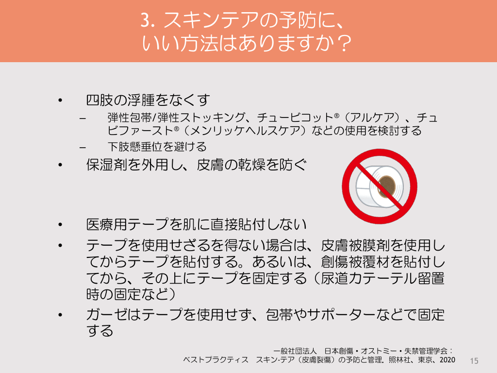 #15. 3. スキンテアの予防に、 いい方法はありますか? • 四肢の浮腫をなくす – – 弾性包帯/弾性ストッキング、チュービコット®(アルケア)、チュ ビファースト®(メンリッケヘルスケア)などの使用を検討する 下肢懸垂位を避ける • 保湿剤を外用し、皮膚の乾燥を防ぐ • • 医療用テープを肌に直接貼付しない テープを使用せざるを得ない場合は、皮膚被膜剤を使用し てからテープを貼付する。あるいは、創傷被覆材を貼付し てから、その上にテープを固定する(尿道カテーテル留置 時の固定など) ガーゼはテープを使用せず、包帯やサポーターなどで固定 する • 一般社団法人 日本創傷・オストミー・失禁管理学会: ベストプラクティス スキン-テア(皮膚裂傷)の予防と管理.照林社、東京、2020 15