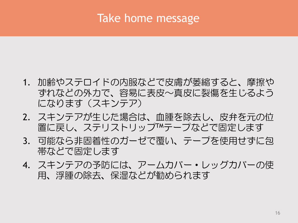 #16. Take home message 1. 加齢やステロイドの内服などで皮膚が萎縮すると、摩擦や ずれなどの外力で、容易に表皮~真皮に裂傷を生じるよう になります(スキンテア) 2. スキンテアが生じた場合は、血腫を除去し、皮弁を元の位 置に戻し、ステリストリップTMテープなどで固定します 3. 可能なら非固着性のガーゼで覆い、テープを使用せずに包 帯などで固定します 4. スキンテアの予防には、アームカバー・レッグカバーの使 用、浮腫の除去、保湿などが勧められます 16
