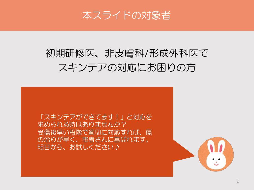 #2. 本スライドの対象者 初期研修医、非皮膚科/形成外科医で スキンテアの対応にお困りの方 「スキンテアができてます!」と対応を 求められる時はありませんか? 受傷後早い段階で適切に対応すれば、傷 の治りが早く、患者さんに喜ばれます。 明日から、お試しください♪ 2