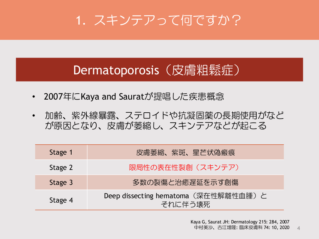 #4. 1. スキンテアって何ですか? Dermatoporosis(皮膚粗鬆症) • 2007年にKaya and Sauratが提唱した疾患概念 • 加齢、紫外線暴露、ステロイドや抗凝固薬の長期使用がなど が原因となり、皮膚が萎縮し、スキンテアなどが起こる Stage 1 皮膚萎縮、紫斑、星芒状偽瘢痕 Stage 2 限局性の表在性裂創(スキンテア) Stage 3 多数の裂傷と治癒遅延を示す創傷 Stage 4 Deep dissecting hematoma(深在性解離性血腫)と それに伴う壊死 Kaya G, Saurat JH: Dermatology 215: 284, 2007 中村美沙、古江増隆: 臨床皮膚科 74: 10, 2020 4