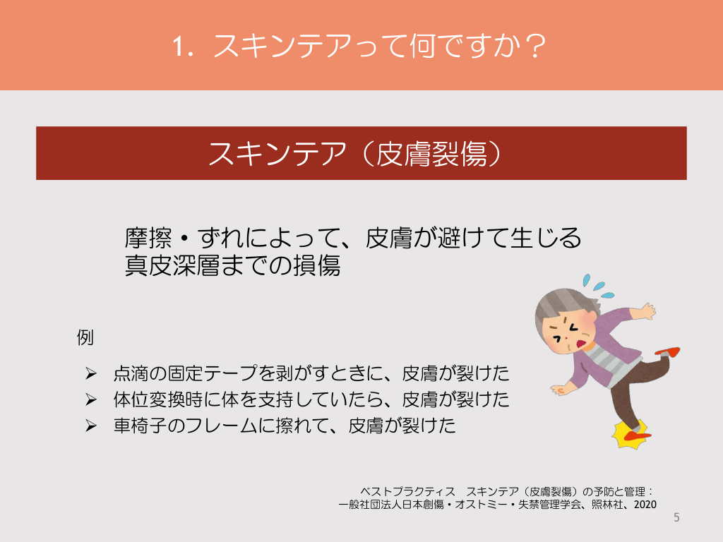 #5. 1. スキンテアって何ですか? スキンテア(皮膚裂傷) 摩擦・ずれによって、皮膚が避けて生じる 真皮深層までの損傷 例 ➢ 点滴の固定テープを剥がすときに、皮膚が裂けた ➢ 体位変換時に体を支持していたら、皮膚が裂けた ➢ 車椅子のフレームに擦れて、皮膚が裂けた ベストプラクティス スキンテア(皮膚裂傷)の予防と管理: 一般社団法人日本創傷・オストミー・失禁管理学会、照林社、2020 5
