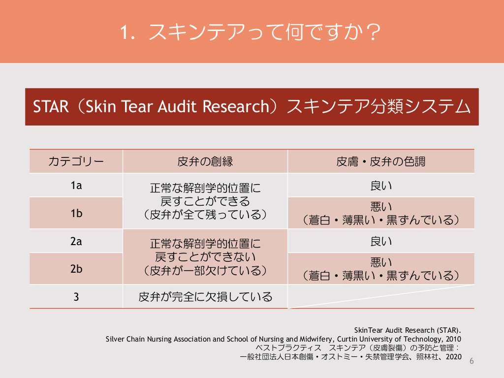 #6. 1. スキンテアって何ですか? STAR(Skin Tear Audit Research)スキンテア分類システム カテゴリー 皮弁の創縁 皮膚・皮弁の色調 1a 正常な解剖学的位置に 戻すことができる (皮弁が全て残っている) 良い 1b 2a 2b 正常な解剖学的位置に 戻すことができない (皮弁が一部欠けている) 3 皮弁が完全に欠損している 悪い (蒼白・薄黒い・黒ずんでいる) 良い 悪い (蒼白・薄黒い・黒ずんでいる) SkinTear Audit Research (STAR). Silver Chain Nursing Association and School of Nursing and Midwifery, Curtin University of Technology, 2010 ベストプラクティス スキンテア(皮膚裂傷)の予防と管理: 一般社団法人日本創傷・オストミー・失禁管理学会、照林社、2020 6