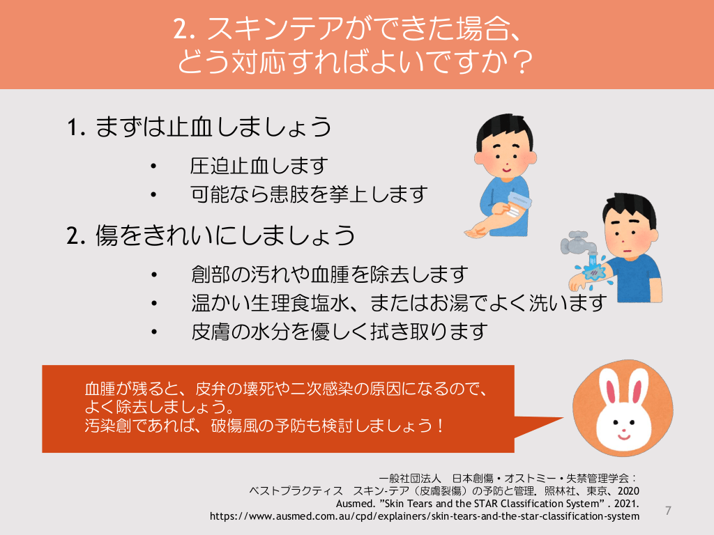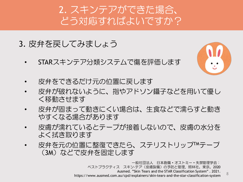 #8. 2. スキンテアができた場合、 どう対応すればよいですか? 3. 皮弁を戻してみましょう • STARスキンテア分類システムで傷を評価します • • 皮弁をできるだけ元の位置に戻します 皮弁が破れないように、指やアドソン鑷子などを用いて優し く移動させます 皮弁が固まって動きにくい場合は、生食などで濡らすと動き やすくなる場合があります 皮膚が濡れているとテープが接着しないので、皮膚の水分を よく拭き取ります 皮弁を元の位置に整復できたら、ステリストリップTMテープ (3M)などで皮弁を固定します • • • 一般社団法人 日本創傷・オストミー・失禁管理学会: ベストプラクティス スキン-テア(皮膚裂傷)の予防と管理.照林社、東京、2020 Ausmed. ”Skin Tears and the STAR Classification System” . 2021. https://www.ausmed.com.au/cpd/explainers/skin-tears-and-the-star-classification-system 8