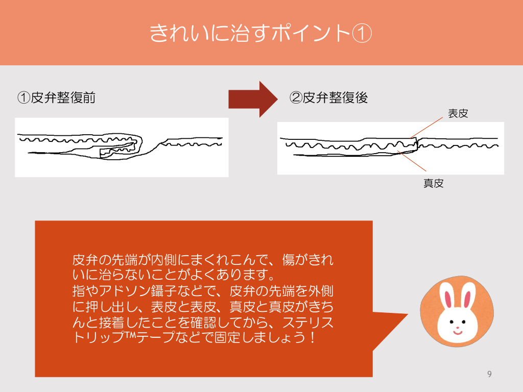 #9. きれいに治すポイント① ①皮弁整復前 ②皮弁整復後 表皮 真皮 皮弁の先端が内側にまくれこんで、傷がきれ いに治らないことがよくあります。 指やアドソン鑷子などで、皮弁の先端を外側 に押し出し、表皮と表皮、真皮と真皮がきち んと接着したことを確認してから、ステリス トリップTMテープなどで固定しましょう! 9