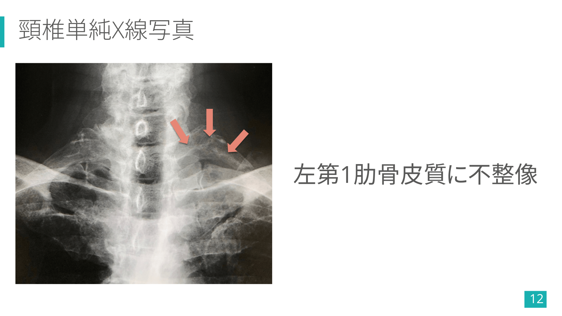 #12. 頸椎単純X線写真 左第1肋骨皮質に不整像 12