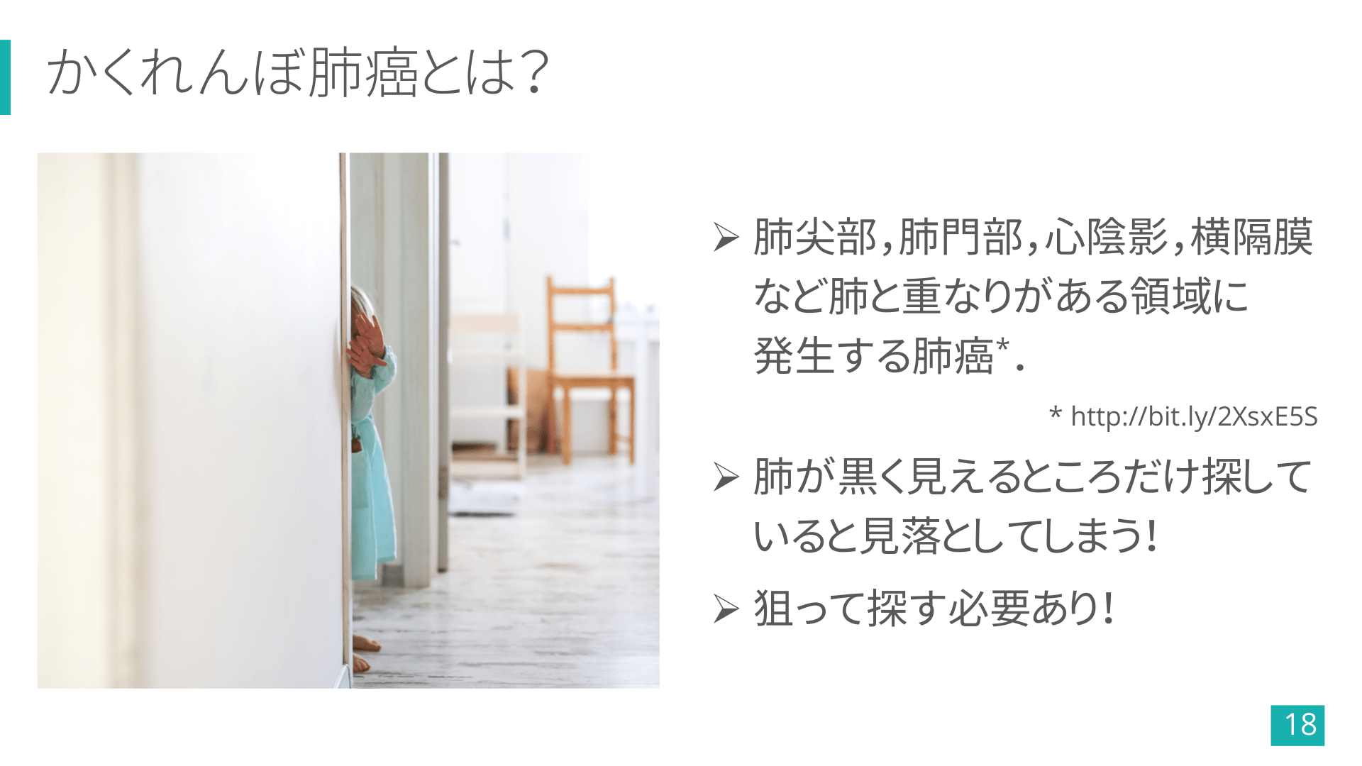 #18. かくれんぼ肺癌とは? Ø 肺尖部,肺門部,心陰影,横隔膜 など肺と重なりがある領域に 発生する肺癌*. * http://bit.ly/2XsxE5S Ø 肺が黒く見えるところだけ探して いると見落としてしまう! Ø 狙って探す必要あり! 18