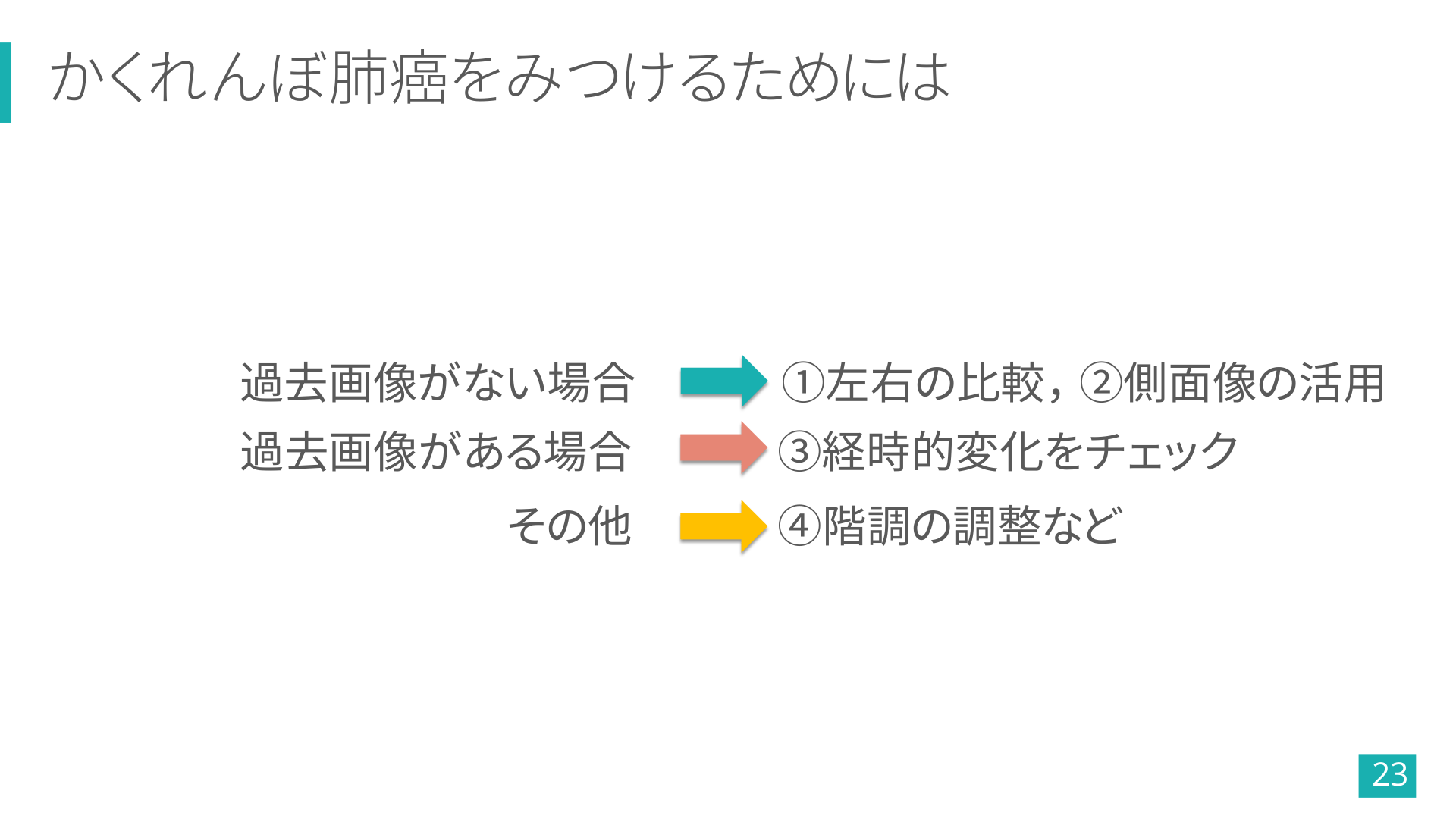#23. かくれんぼ肺癌をみつけるためには 過去画像がない場合 ①左右の比較, ②側面像の活用 過去画像がある場合 ③経時的変化をチェック その他 ④階調の調整など 23
