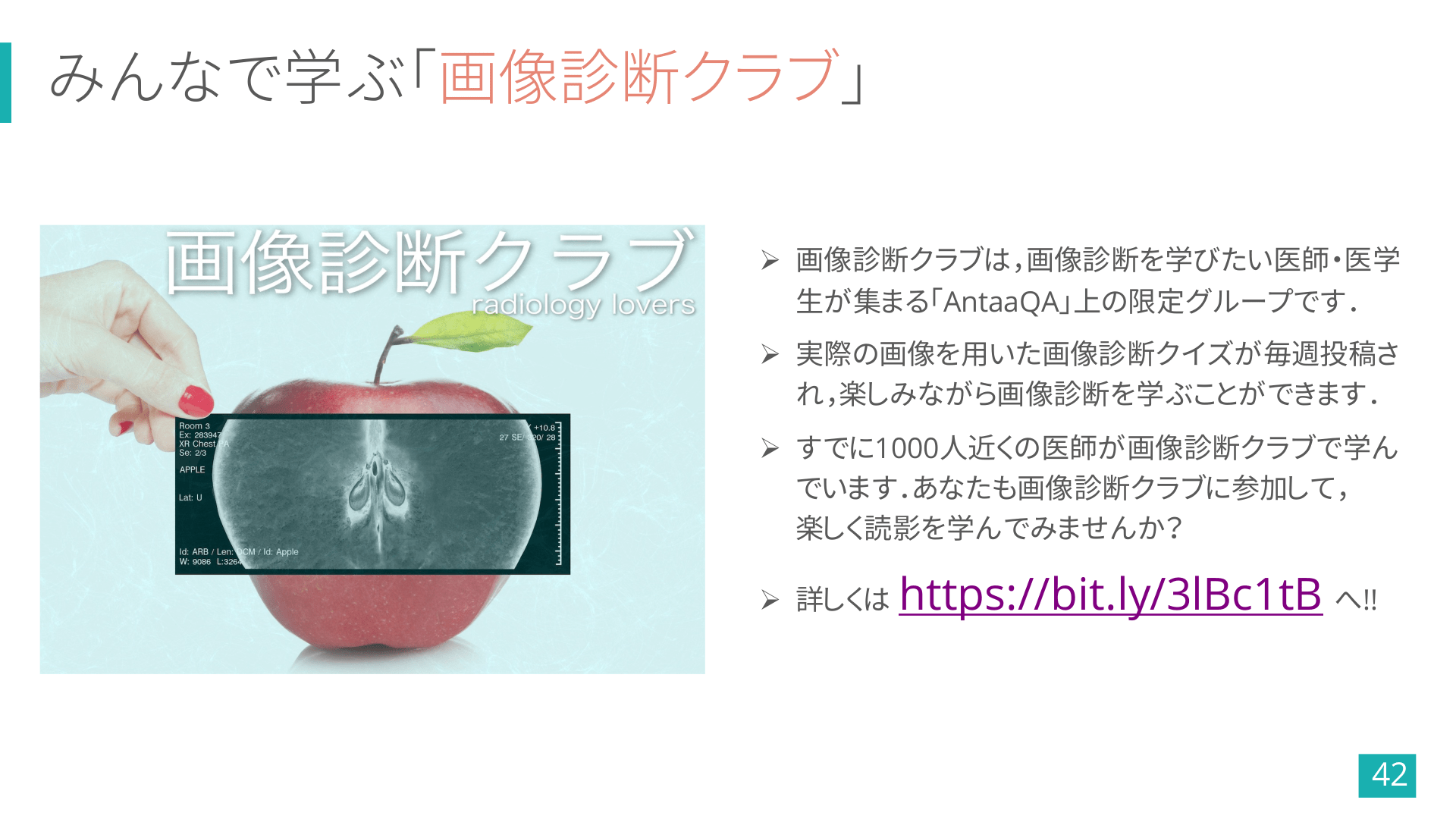 #42. みんなで学ぶ「画像診断クラブ」 Ø 画像診断クラブは,画像診断を学びたい医師・医学 生が集まる「AntaaQA」上の限定グループです. Ø 実際の画像を用いた画像診断クイズが毎週投稿さ れ,楽しみながら画像診断を学ぶことができます. Ø すでに1000人近くの医師が画像診断クラブで学ん でいます.あなたも画像診断クラブに参加して, 楽しく読影を学んでみませんか? Ø 詳しくは https://bit.ly/3lBc1tB へ!! 42