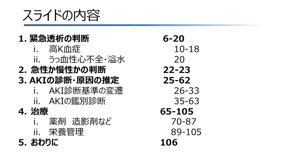 腎機能が低下した患者に出会った際の適切な管理方法について解説します。緊急透析が必要かどうかの判断や、高カリウム血症の原因、急性腎障害(AKI)と慢性腎疾患(CKD)の鑑別診断について詳しく述べています。また、特定の症例を通じて、治療戦略や薬物療法、栄養管理のポイントについても触れています。このスライドは、医師が実際の臨床において役立てることができる内容になっています。(AI作成そのまま)