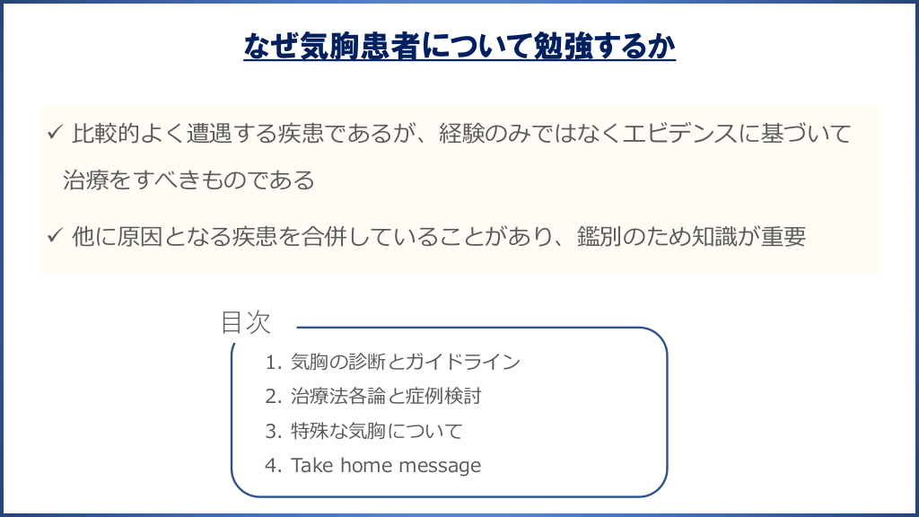気胸について概要・各治療法・海外のものも含めたガイドラインと、まれな疾患など鑑別を要する疾患についてを、このスライドを見返せば一通り網羅できるようにしています。国家試験に向けて勉強中の医学生さん、気胸の患者さんを診察する初期・後期研修医の先生、稀な種類の気胸についても勉強したい先生のお役に立ちましたら幸いです。