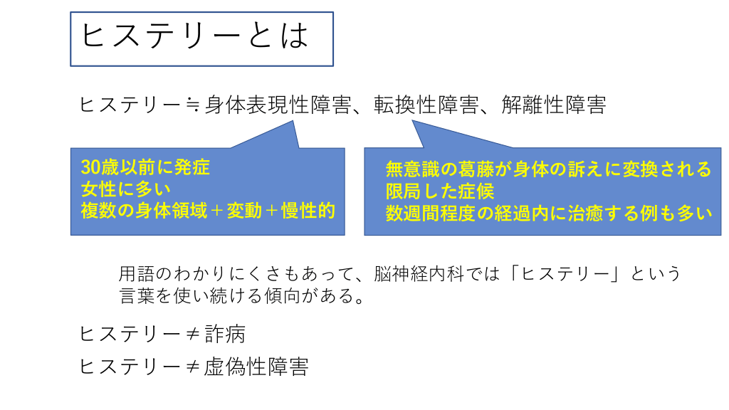 #2. ヒステリーとは ヒステリー≒身体表現性障害、転換性障害、解離性障害 30歳以前に発症 女性に多い 複数の身体領域+変動+慢性的 無意識の葛藤が身体の訴えに変換される 限局した症候 数週間程度の経過内に治癒する例も多い 用語のわかりにくさもあって、脳神経内科では「ヒステリー」という 言葉を使い続ける傾向がある。 ヒステリー≠詐病 ヒステリー≠虚偽性障害