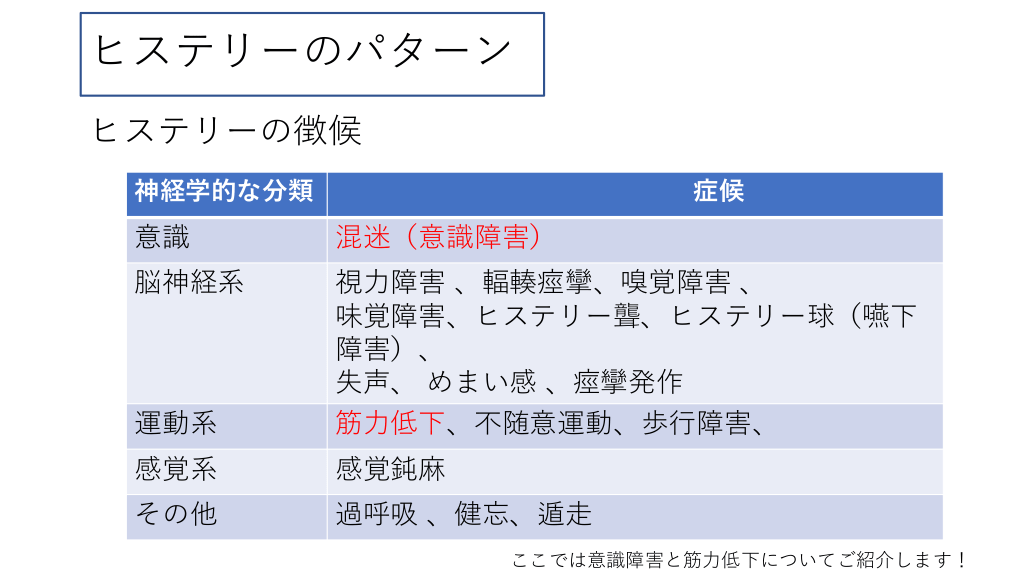 #3. ヒステリーのパターン ヒステリーの徴候 神経学的な分類 症候 意識 混迷(意識障害) 脳神経系 運動系 視力障害 、輻輳痙攣、嗅覚障害 、 味覚障害、ヒステリー聾、ヒステリー球(嚥下 障害)、 失声、 めまい感 、痙攣発作 筋力低下、不随意運動、歩行障害、 感覚系 感覚鈍麻 その他 過呼吸 、健忘、遁走 ここでは意識障害と筋力低下についてご紹介します!