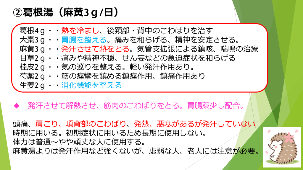 #10. ②葛根湯(麻黄3g/日) 葛根4g・・熱を冷まし、後頚部・背中のこわばりを治す 大棗3g・・胃腸を整える。痛みを和らげる、精神を安定させる。 麻黄3g・・発汗させて熱をとる。気管支拡張による鎮咳、喘鳴の治療 甘草2g・・痛みや精神不穏、せん妄などの急迫症状を和らげる 桂皮2g・・気の巡りを整える。軽い発汗作用あり。 芍薬2g・・筋の痙攣を鎮める鎮痙作用、鎮痛作用あり 生姜2g・・消化機能を整える ◆ 発汗させて解熱させ、筋肉のこわばりをとる。胃腸薬少し配合。 頭痛、肩こり、項背部のこわばり、発熱、悪寒があるが発汗していない 時期に用いる。初期症状に用いるため長期に使用しない。 体力は普通~やや頑丈な人に使用する。 麻黄湯よりは発汗作用など強くないが、虚弱な人、老人には注意が必要。