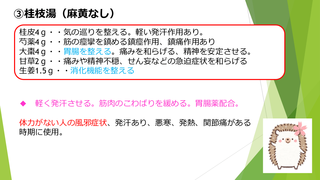 #11. ③桂枝湯(麻黄なし) 桂皮4g・・気の巡りを整える。軽い発汗作用あり。 芍薬4g・・筋の痙攣を鎮める鎮痙作用、鎮痛作用あり 大棗4g・・胃腸を整える。痛みを和らげる、精神を安定させる。 甘草2g・・痛みや精神不穏、せん妄などの急迫症状を和らげる 生姜1.5g・・消化機能を整える ◆ 軽く発汗させる。筋肉のこわばりを緩める。胃腸薬配合。 体力がない人の風邪症状、発汗あり、悪寒、発熱、関節痛がある 時期に使用。